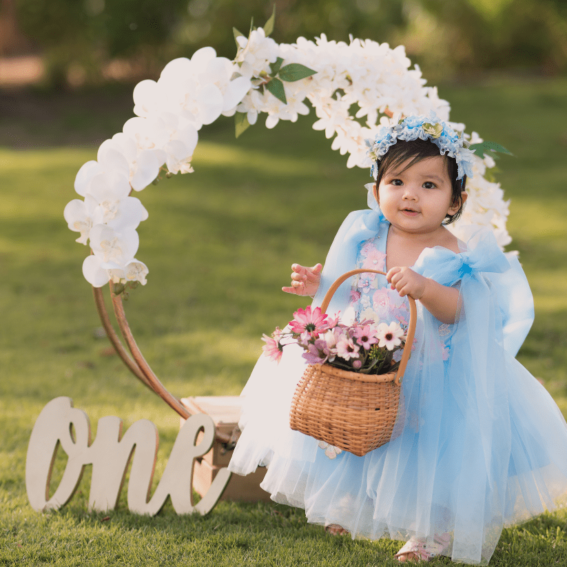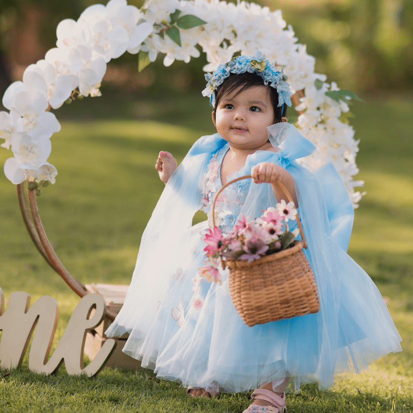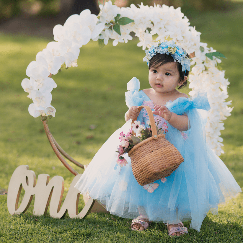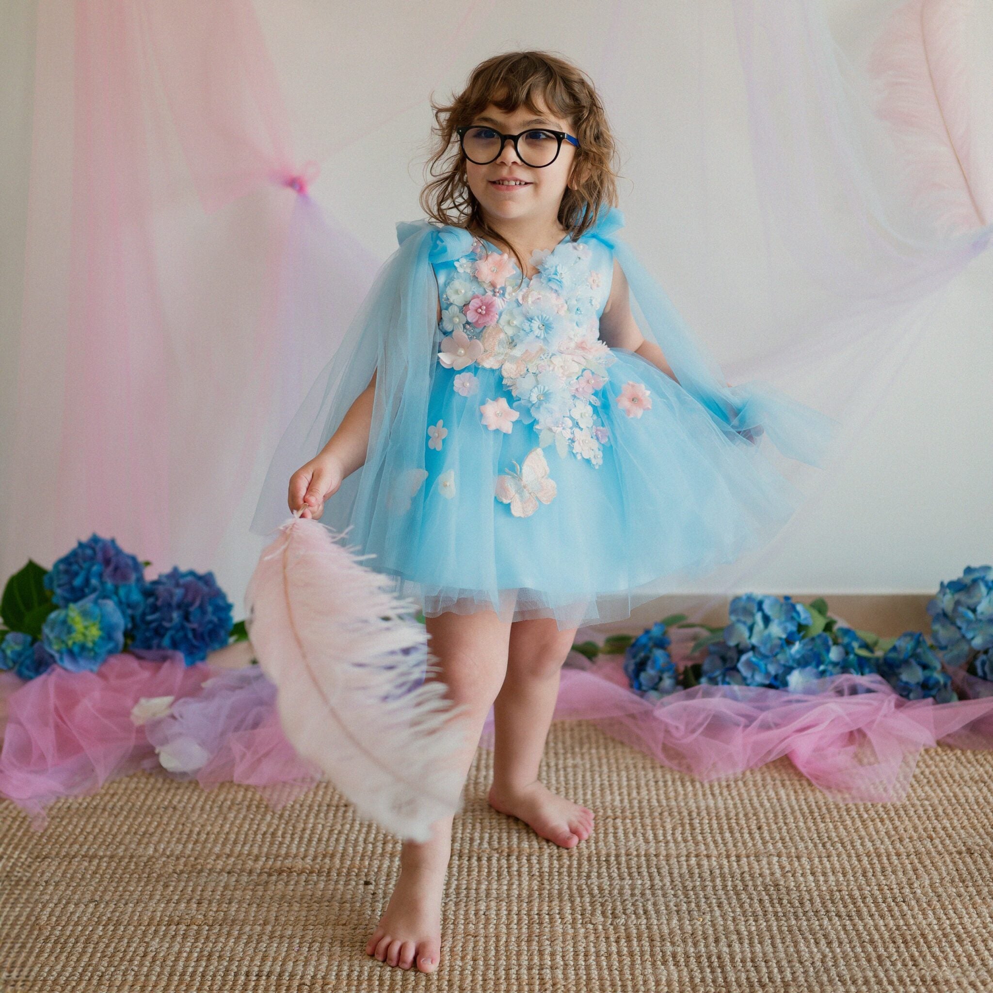 The Elena dress is a simply showstopping look, with stunning floral adornments over a soft tulle bodice and skirt. The soft blue colour contrasts beautifully with the pink flowers, and large bows on the shoulders add an elegant touch. This princess-like gown will match perfectly with pretty party shoes and a hair bow, and comes in sizes 1 - 10 years.
